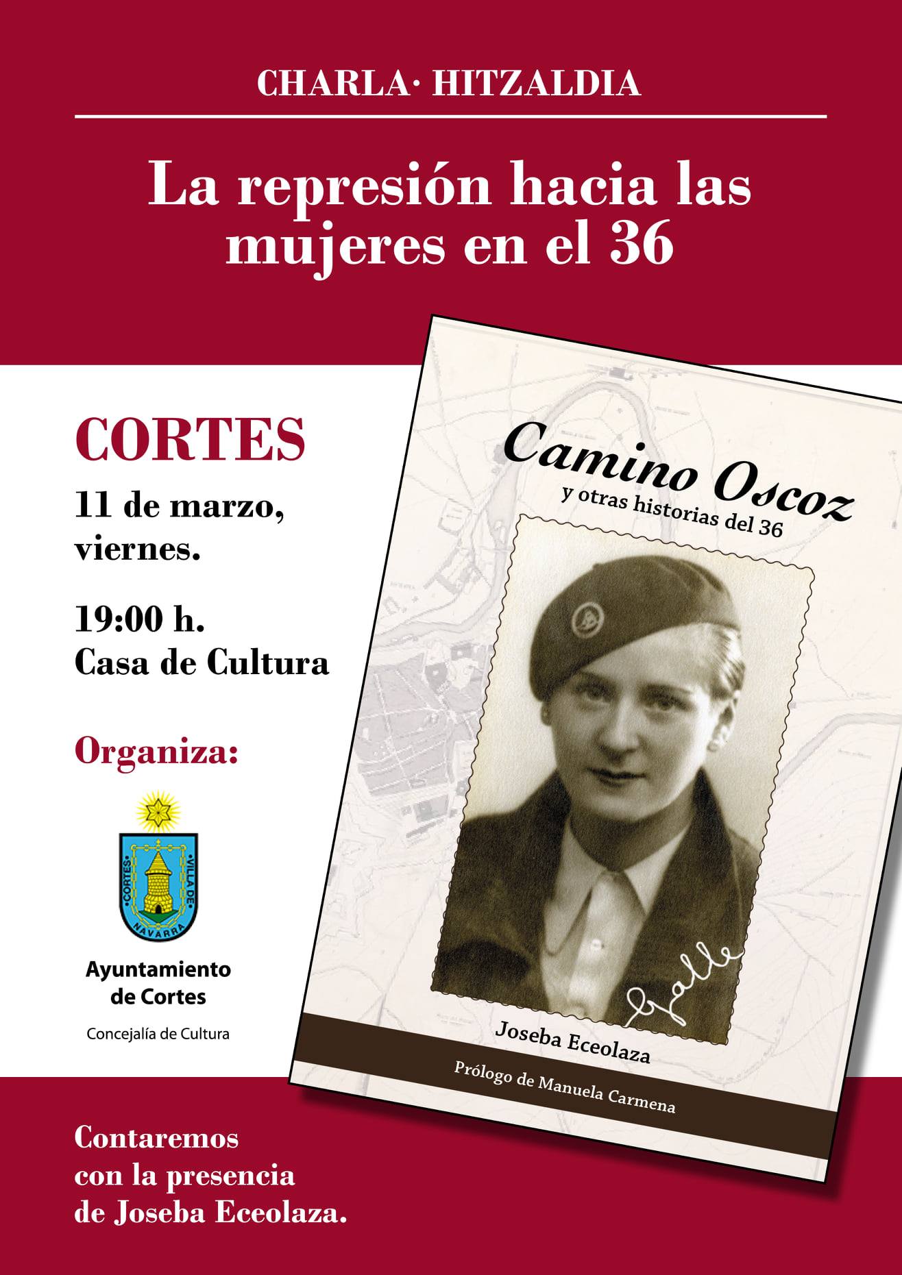 La Casa de Cultura de Cortes acoge mañana viernes a las 19.00 horas una charla sobre 'La represión a las mujeres en el 36' que impartirá Joseba Eceolaza, autor del libro 'Camino Osc oz y otras historias del 36'. El Ayuntamiento de Cortes organiza esta jornada.